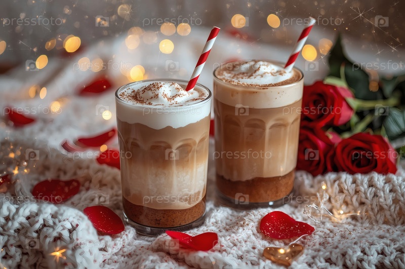 Концепт кафе или кафе в честь Дня святого Валентина. Вкусный многослойный кофе в прозрачном стакане, сердца и лепестки роз крупным планом