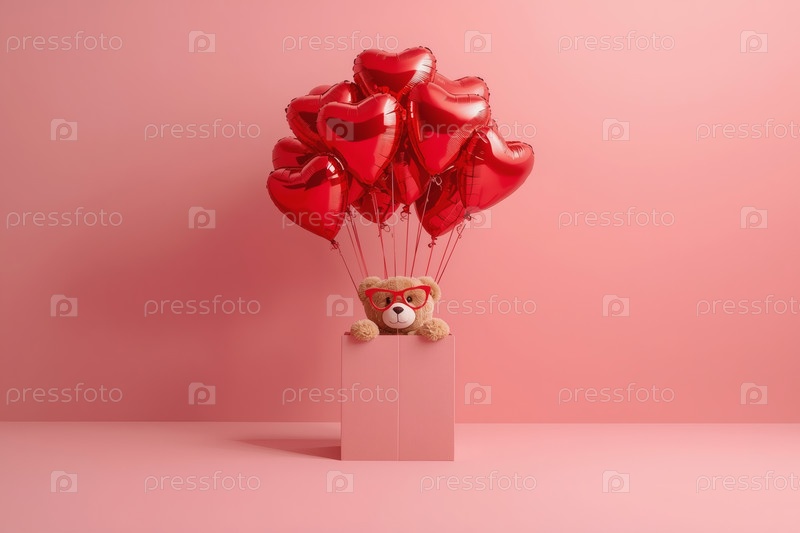 Концепция Дня святого Валентина. Минимализм. Подарок с плюшевым медведем и воздушными шарами на красном студийном фоне