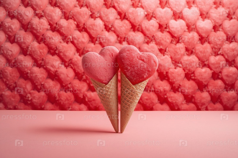 Сладкий десерт. Любовь к мороженому. Минимализм. Два вафельных шишка в форме сердца на красном фоне. Концепция Дня святого Валентина. Баннер, реклама