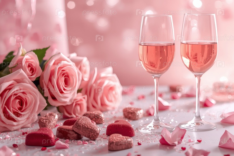 Концепция Дня святого Валентина. Два бокала розового вина и шоколадных конфет в окружении роз и сердец в День святого Валентина
