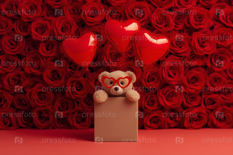 Концепция Дня святого Валентина. Минимализм. Подарок с плюшевым медведем и воздушными шарами на красном студийном фоне