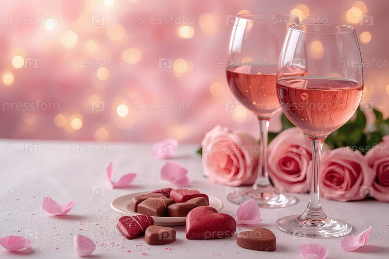 Концепция Дня святого Валентина. Два бокала розового вина и шоколадных конфет в окружении роз и сердец в День святого Валентина