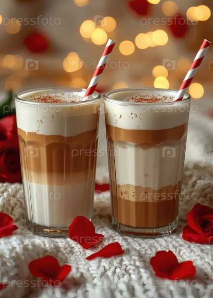 Концепт кафе или кафе в честь Дня святого Валентина. Вкусный многослойный кофе в прозрачном стакане, сердца и лепестки роз крупным планом