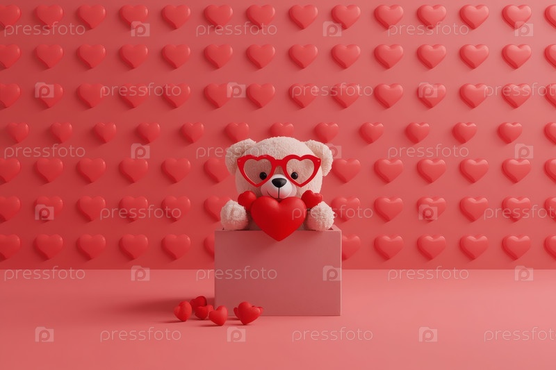 Концепция Дня святого Валентина. Минимализм. Подарок с плюшевым медведем и воздушными шарами на красном студийном фоне