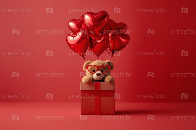 Концепция Дня святого Валентина. Минимализм. Подарок с плюшевым медведем и воздушными шарами на красном студийном фоне