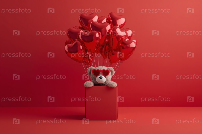 Концепция Дня святого Валентина. Минимализм. Подарок с плюшевым медведем и воздушными шарами на красном студийном фоне