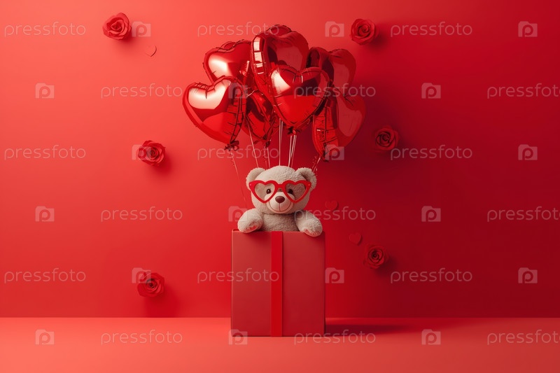 Концепция Дня святого Валентина. Минимализм. Подарок с плюшевым медведем и воздушными шарами на красном студийном фоне