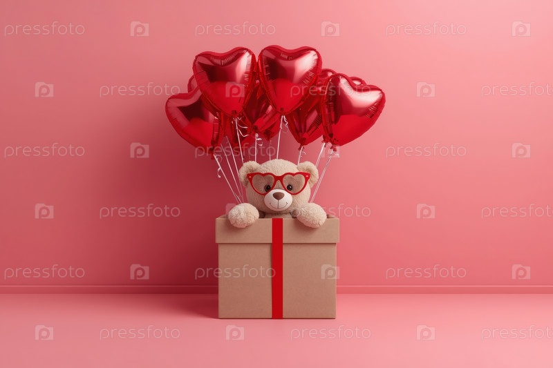 Концепция Дня святого Валентина. Минимализм. Подарок с плюшевым медведем и воздушными шарами на красном студийном фоне