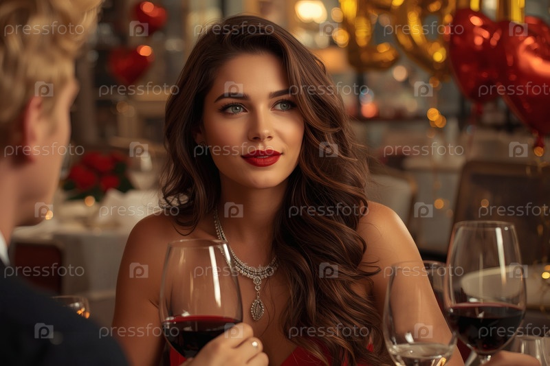 Концепция Дня святого Валентина. Элегантная влюбленная пара наслаждается романтическим ужином при свечах с бокалами вина в роскошный вечер