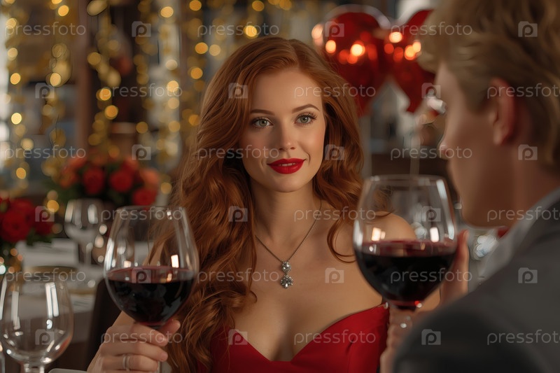 Концепция Дня святого Валентина. Элегантная влюбленная пара наслаждается романтическим ужином при свечах с бокалами вина в роскошный вечер