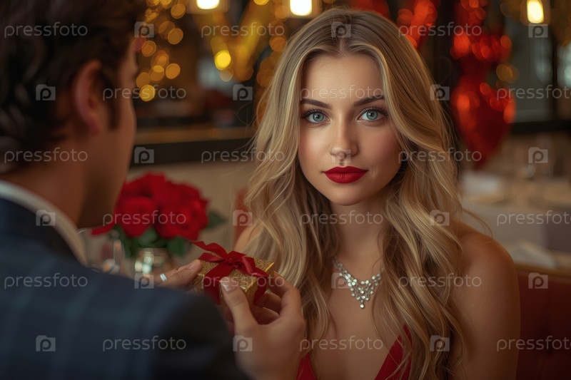 Концепция Дня святого Валентина. Элегантная влюбленная пара наслаждается романтическим ужином с бокалами вина в роскошный вечер. Мужчина делает подарок своей возлюбленной