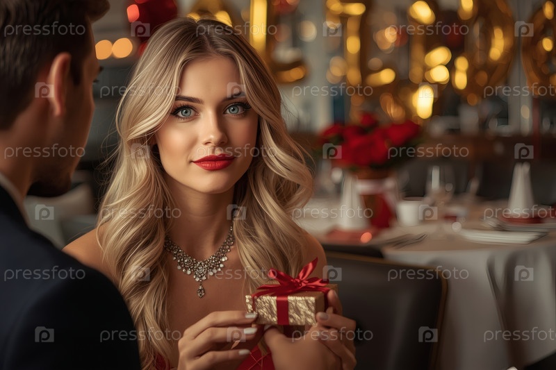 Концепция Дня святого Валентина. Элегантная влюбленная пара наслаждается романтическим ужином с бокалами вина в роскошный вечер. Мужчина делает подарок своей возлюбленной