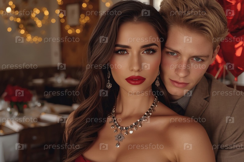 Концепция Дня святого Валентина. Портрет элегантной влюбленной пары на роскошном вечере в ресторане. Мужчина целует свою любимую
