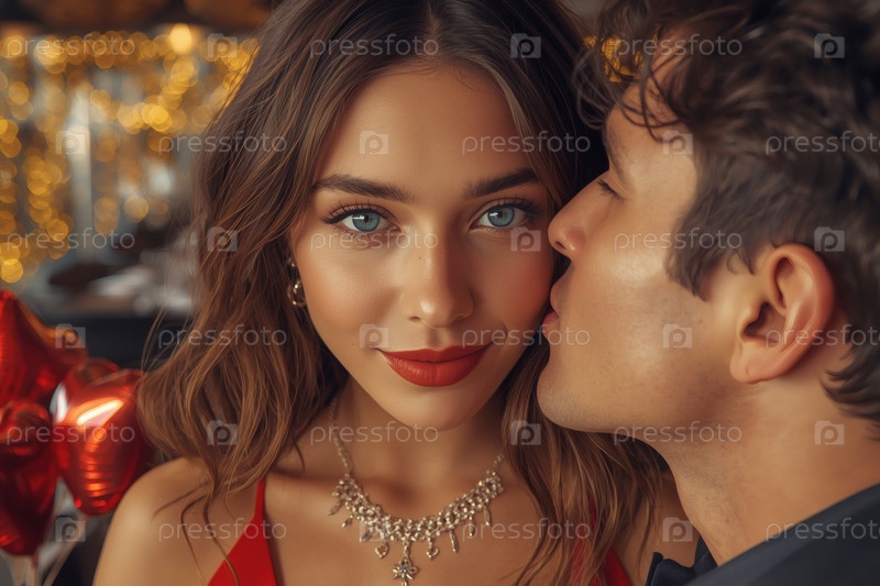 Концепция Дня святого Валентина. Портрет элегантной влюбленной пары на роскошном вечере в ресторане. Мужчина целует свою любимую