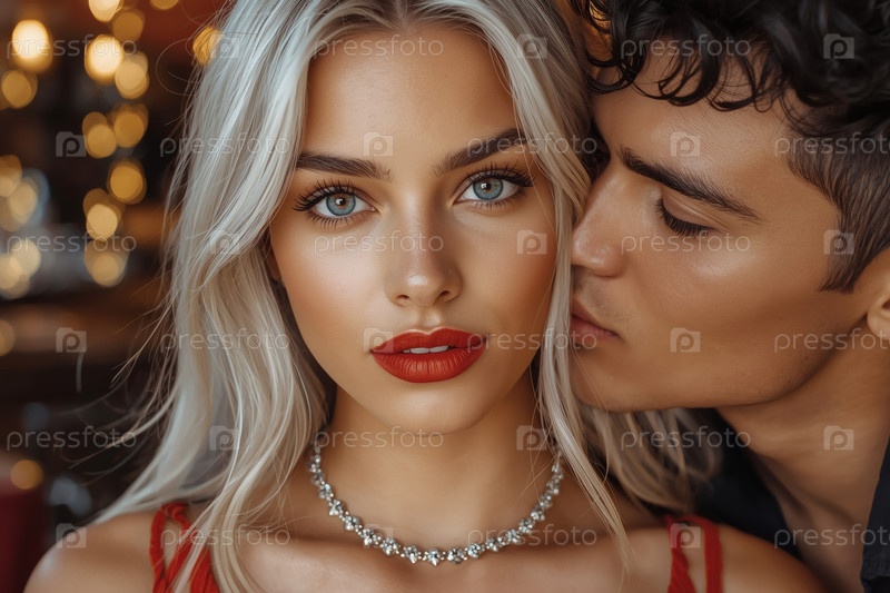 Концепция Дня святого Валентина. Портрет элегантной влюбленной пары на роскошном вечере в ресторане. Мужчина целует свою любимую