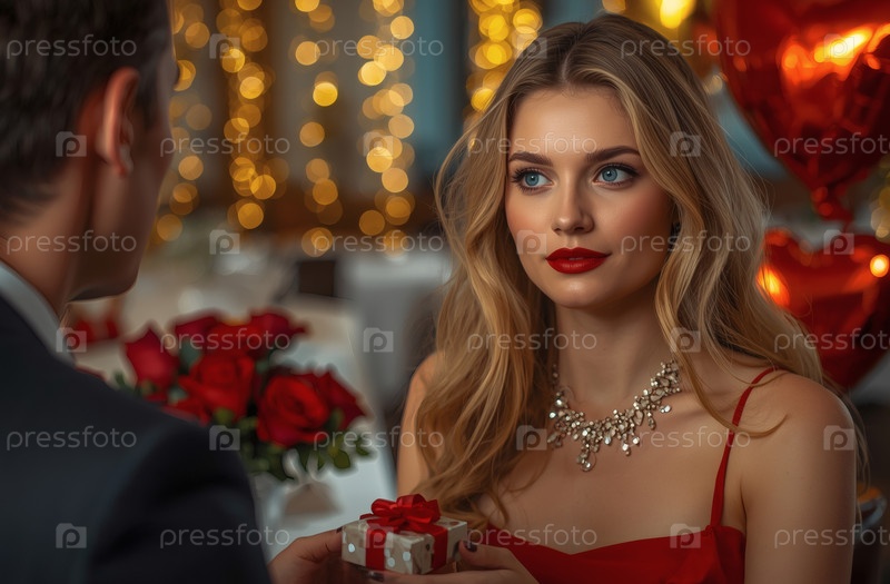 Концепция Дня святого Валентина. Элегантная влюбленная пара наслаждается романтическим ужином с бокалами вина в роскошный вечер. Мужчина делает подарок своей возлюбленной
