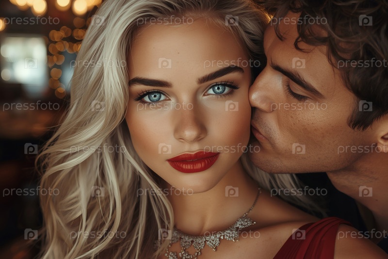Концепция Дня святого Валентина. Портрет элегантной влюбленной пары на роскошном вечере в ресторане. Мужчина целует свою любимую