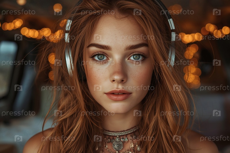 Молодая красивая рыжеволосая женщина с веснушками слушает музыку на больших беспроводных наушниках, путешествуя по автодому. Любитель музыки