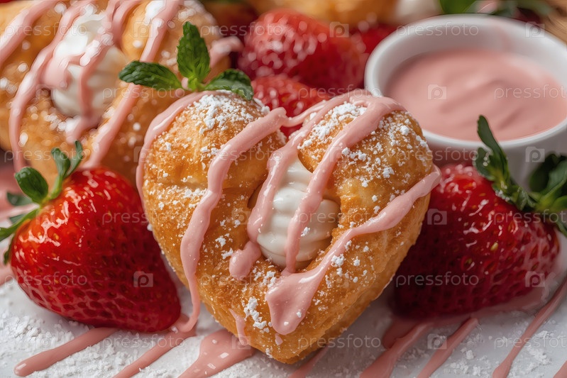 Домашние торты в форме сердца с розовым шоколадом и свежей клубникой. Пироги в форме сердца на светлом фоне. Свежеиспеченный десерт на День святого Валентина