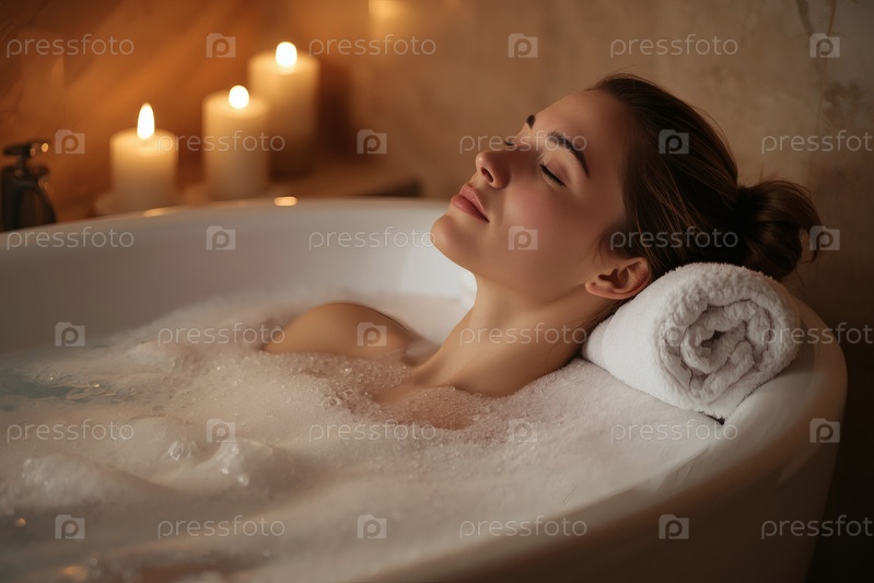 Красивая женщина без макияжа. Она принимает ванну с пузырьками. На заднем плане - интерьер ванной комнаты и свечи. Концепция спа и релаксации
