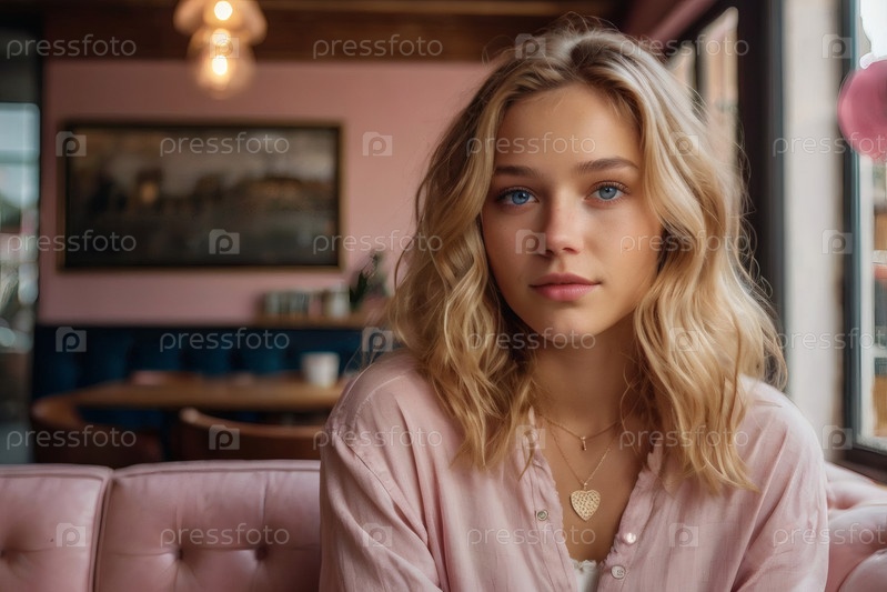 Молодая, красивая блондинка с выразительными голубыми глазами на размытом фоне кафе с мягким розовым интерьером