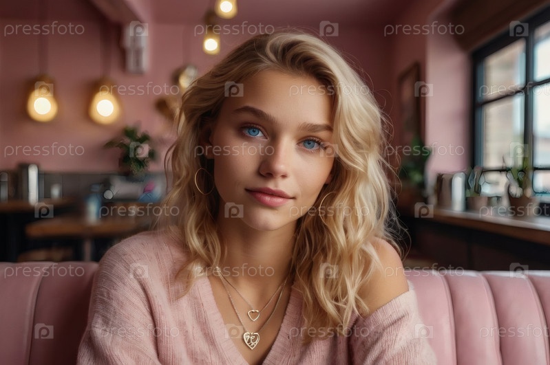 Молодая, красивая блондинка с выразительными голубыми глазами на размытом фоне кафе с мягким розовым интерьером