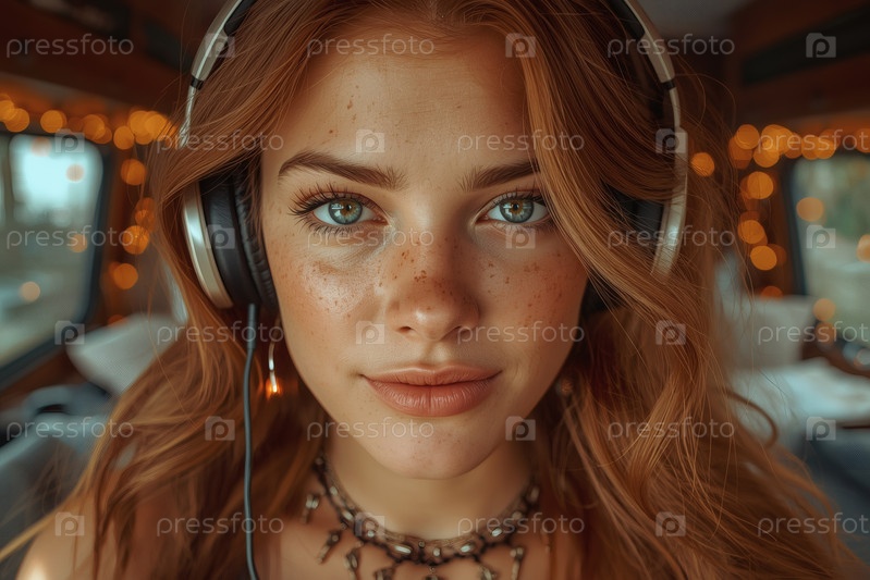 Молодая красивая рыжеволосая женщина с веснушками слушает музыку на больших беспроводных наушниках, путешествуя по автодому. Любитель музыки