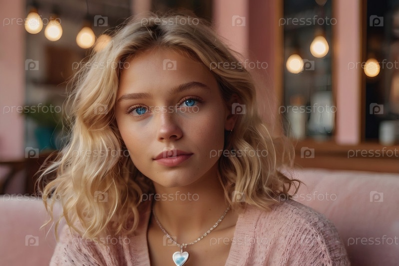Молодая, красивая блондинка с выразительными голубыми глазами на размытом фоне кафе с мягким розовым интерьером