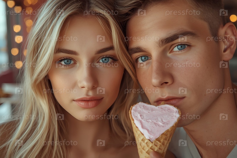 Концепция Дня святого Валентина. Симпатичная влюбленная пара наслаждается мороженым в розовом кафе