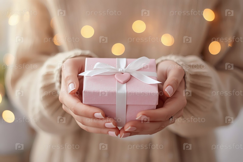 Концепция Дня святого Валентина. Закрытие рук женщины, держащей в форме сердца подарок с атласным луком на День святого Валентина