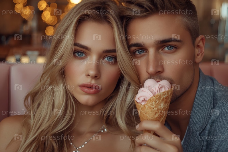 Концепция Дня святого Валентина. Симпатичная влюбленная пара наслаждается мороженым в розовом кафе