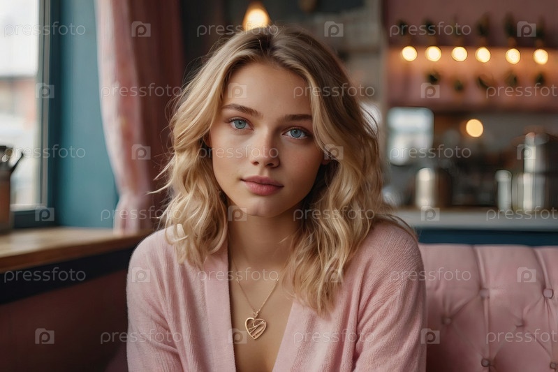 Молодая, красивая блондинка с выразительными голубыми глазами на размытом фоне кафе с мягким розовым интерьером