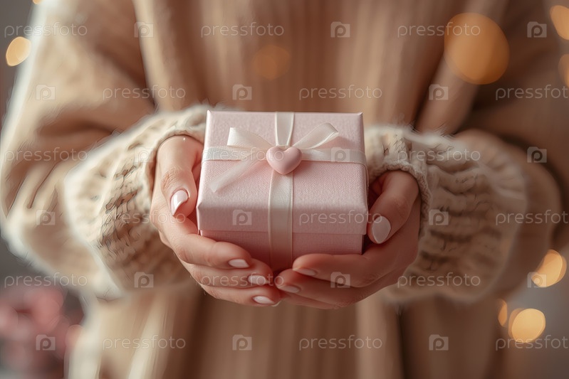 Концепция Дня святого Валентина. Закрытие рук женщины, держащей в форме сердца подарок с атласным луком на День святого Валентина