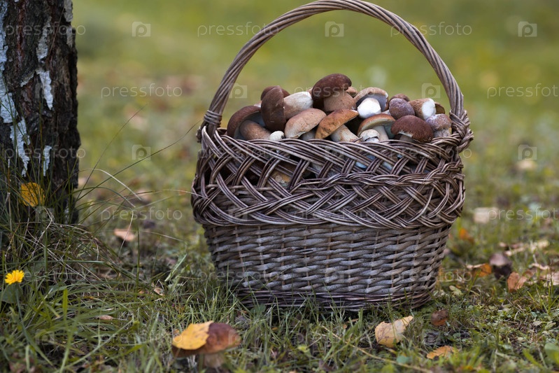 Boletus edulis белые лесные грибы в плетеной корзине. Благородный королевский гриб. Белый гриб. Сбор грибов в лесу