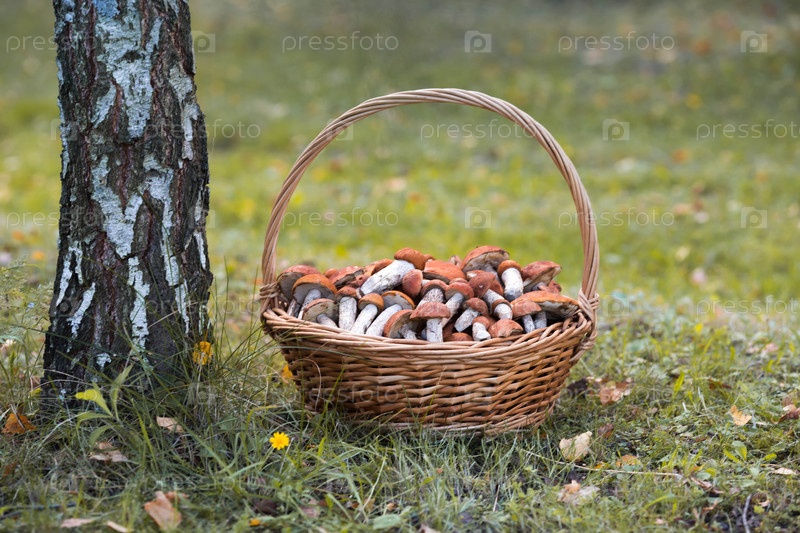 Красные грибы, осиновые грибы, красные шапки рода Laccinum (Обабок) в плетеной корзине. Благородный гриб. Сбор грибов