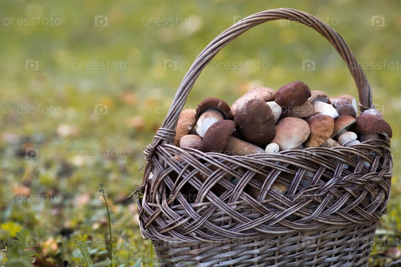 Boletus edulis белые лесные грибы в плетеной корзине. Благородный королевский гриб. Белый гриб. Сбор грибов в лесу
