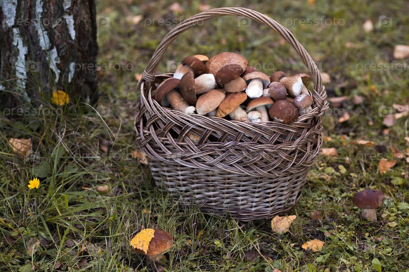 Boletus edulis белые лесные грибы в плетеной корзине. Благородный королевский гриб. Белый гриб. Сбор грибов в лесу