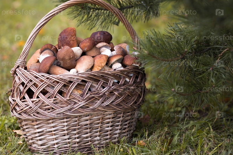 Boletus edulis белые лесные грибы в плетеной корзине. Благородный королевский гриб. Белый гриб. Сбор грибов в лесу