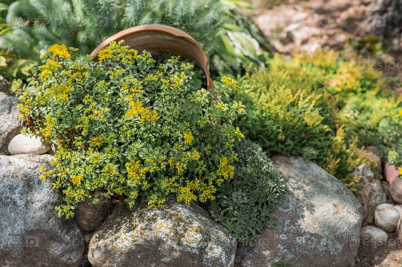 Ландшафтный дизайн. Посадка, озеленение и зелень. Альпийский холм. Естественный, цветущий и экологически чистый фон