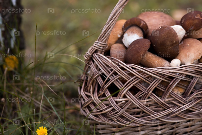 Boletus edulis белые лесные грибы в плетеной корзине. Благородный королевский гриб. Белый гриб. Сбор грибов в лесу