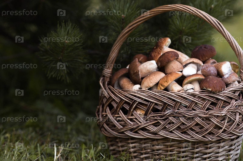 Boletus edulis белые лесные грибы в плетеной корзине. Благородный королевский гриб. Белый гриб. Сбор грибов в лесу