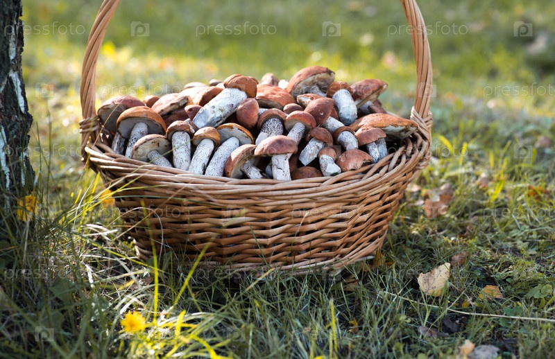 Красные грибы, осиновые грибы, красные шапки рода Laccinum (Обабок) в плетеной корзине. Благородный гриб. Сбор грибов