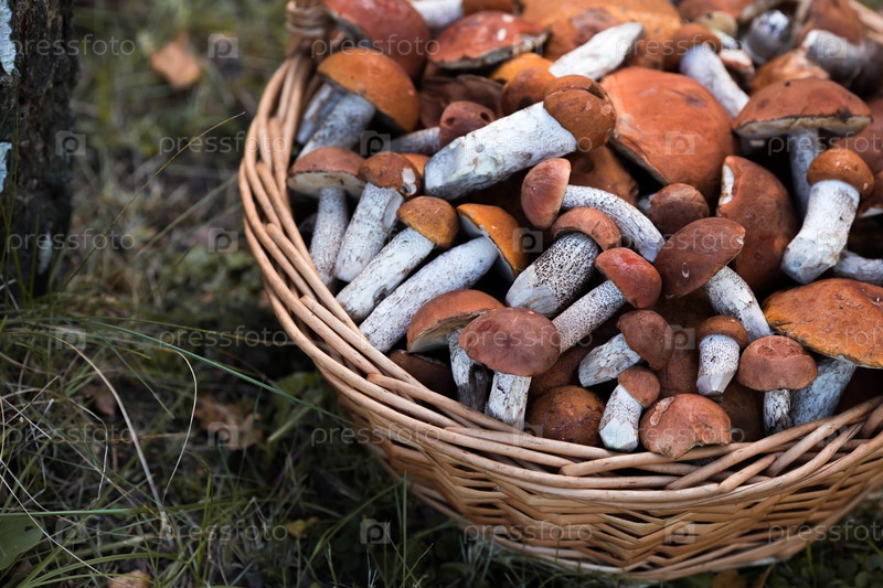 Красные грибы, осиновые грибы, красные шапки рода Laccinum (Обабок) в плетеной корзине. Благородный гриб. Сбор грибов