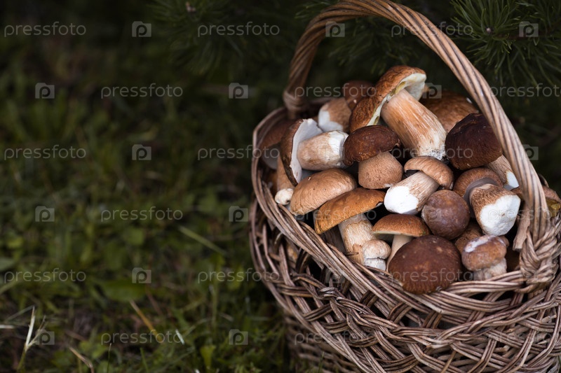 Boletus edulis белые лесные грибы в плетеной корзине. Благородный королевский гриб. Белый гриб. Сбор грибов в лесу