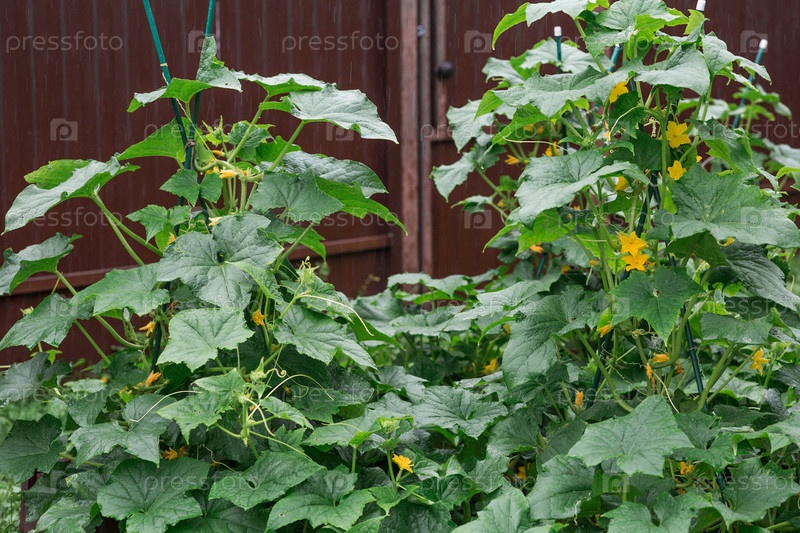 Выращивание огурцов. Стволы, зеленые листья, цветы и маленькие огурцы. Садоводство и сбор урожая для здоровой диеты
