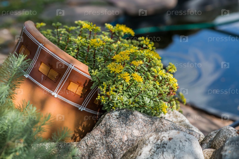 Ландшафтный дизайн. Посадка, озеленение и зелень. Альпийский холм. Естественный, цветущий и экологически чистый фон