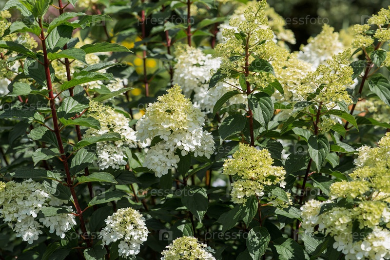 Летняя фотография или фон с цветами. Красивый пейзаж на природе с цветущей панической гортензией. Красивые здоровые гортензии цветут в розовых и белых оттенках