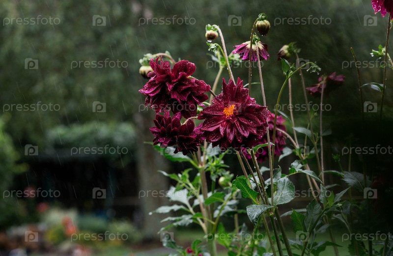 Далия в красном, бордовом цвете. Далия цветет под дождем каплями воды крупным планом. Красивый естественный, цветочный фон
