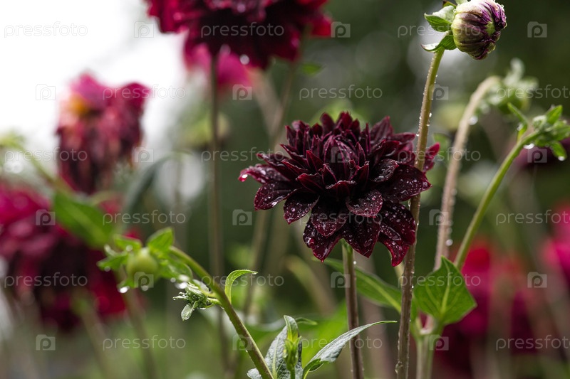 Далия в красном, бордовом цвете. Далия цветет под дождем каплями воды крупным планом. Красивый естественный, цветочный фон