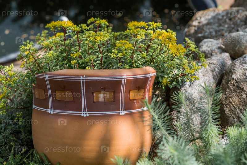 Ландшафтный дизайн. Посадка, озеленение и зелень. Альпийский холм. Естественный, цветущий и экологически чистый фон